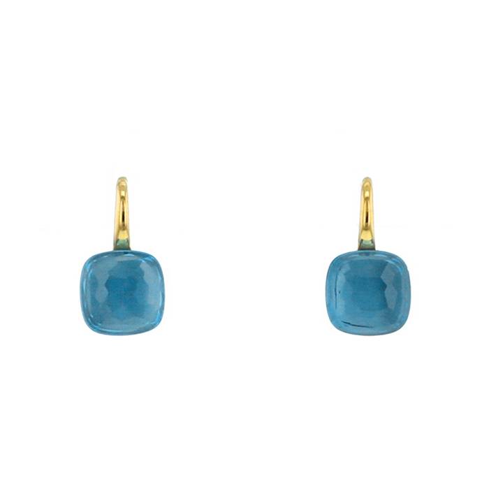Preciosos pendientes Pomellato Nudo de oro rosa y topacio azul, compuestos de un elegante engaste abombado de oro rosa, adornados de elegante cabujón facetado de topacio azul.