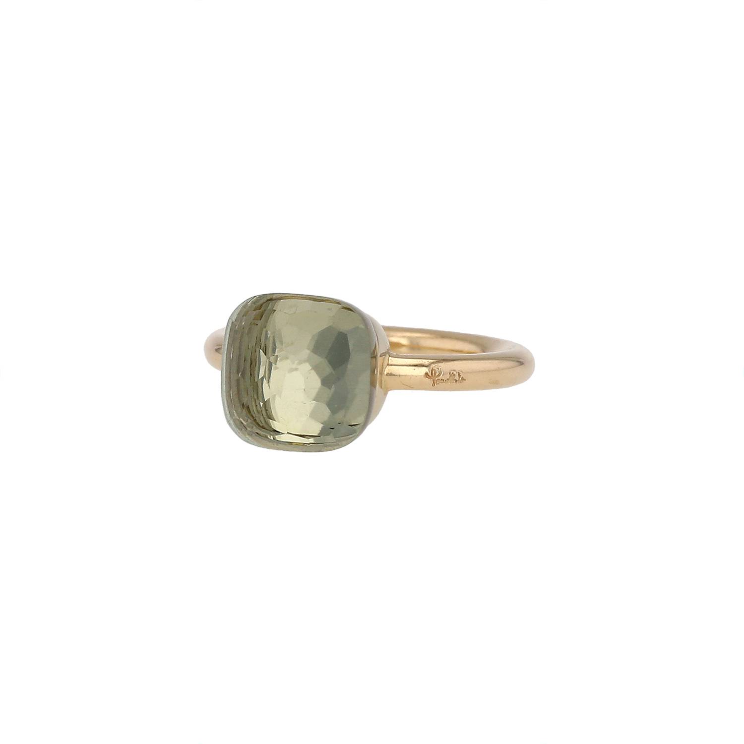 Sortija Pomellato Nudo de oro rosa, de oro blanco, y en cuarzo, compuesta de un bonito anillo de oro rosa, que sujeta en el centro un diseño abombado de oro blanco elegantemente engastado de un cabujón facetado de cuarzo verde.