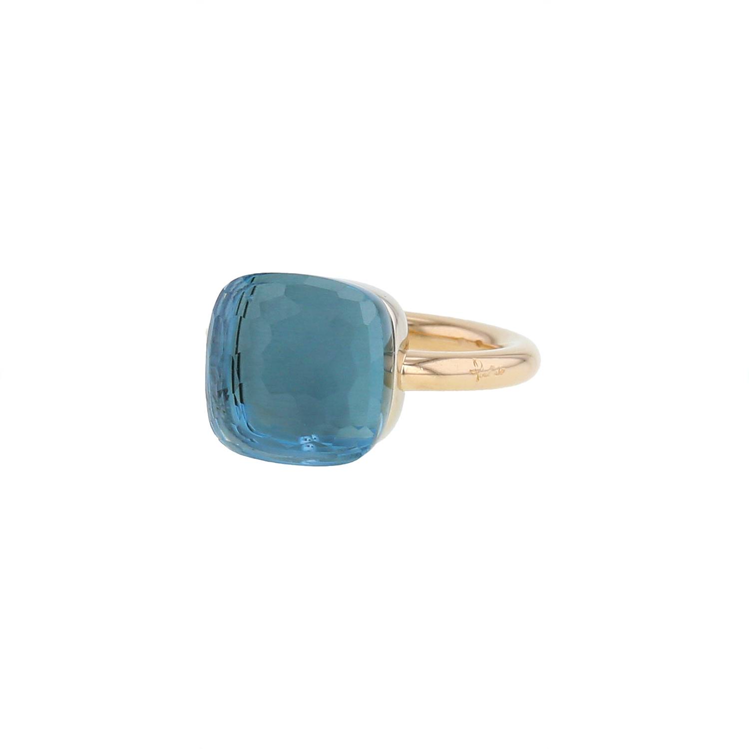 Sortija Pomellato Nudo Maxi de oro rosa y topacio azul, compuesta de un magnífico cabujón facetado de topacio azul, realzada de un bonito anillo abombado de oro rosa.
