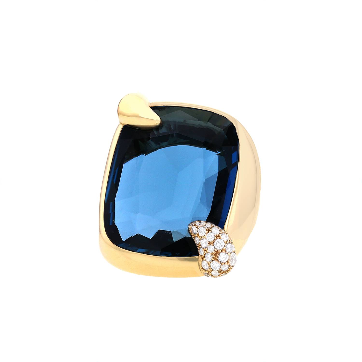Sortija Pomellato Ritratto modelo grande de oro rosa, de topacio azul London, y en diamantes, compuesta de una importante engaste abombado de oro rosa, que sujeta una magnífico topacio azul London facetado, realzada de una elegante garra finamente engastada de diamantes de talla brillante.