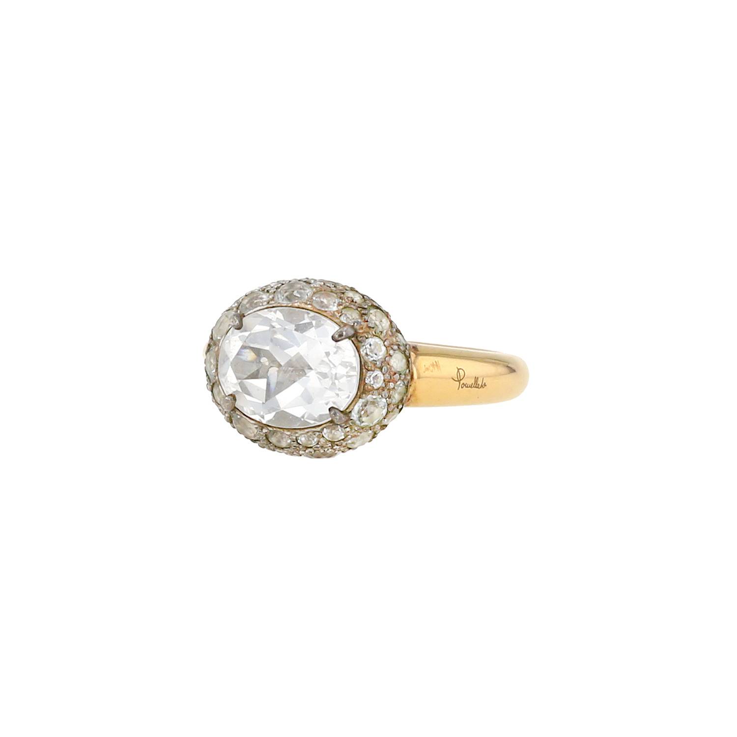 Muy bonita sortija Pomellato Tabou de oro rosa, de plata, y en topacios blancos, compuesta de un elegante diseño ovalado abombado de plata finamente engastado de topacios de talla redonda, adornada en el centro de una importante topacio de talla óvalo, rodeada de una precioso engaste de oro rosa.