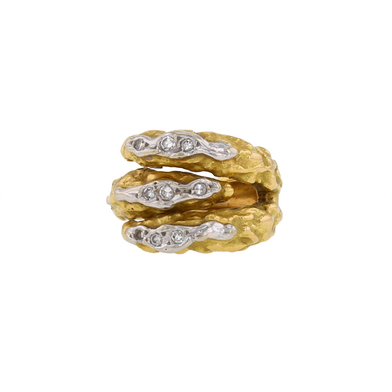 Sortija Sterlé de oro amarillo, de oro blanco, y en diamantes, compuesta de 3 motivos texturados de oro amarillo, adornada de un diseño de oro blanco delicadamente engastado de diamantes de talla 8/8.