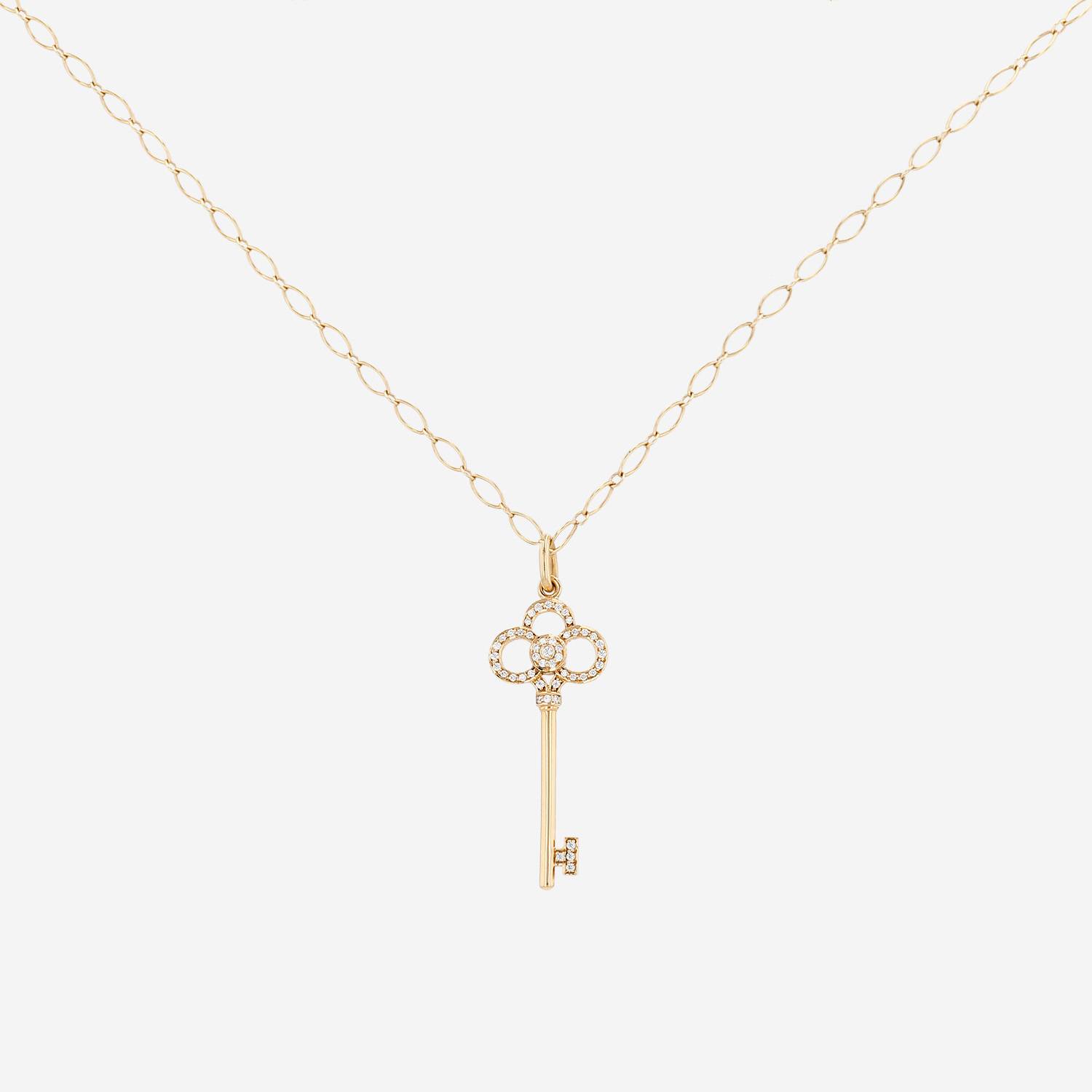 Collar Tiffany & Co Clé Couronne de oro amarillo y diamantes, en el cual figura una preciosa llave calada de oro amarillo engastada de diamantes de talla brillante 0.10 quilate de de aproximadamente, sujetado por una cadena de oro amarillo.