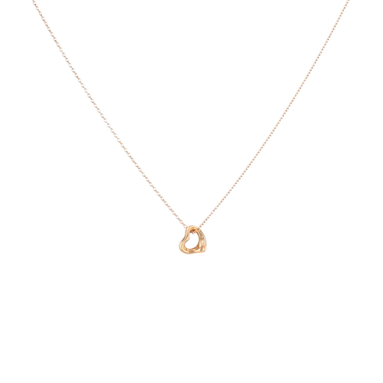 Precioso collar Tiffany & Co Open Heart mini de oro rosa, en el cual figura un elegante corazón ondulado calado de oro rosa, sujetado por una delgada cadena de oro rosa.