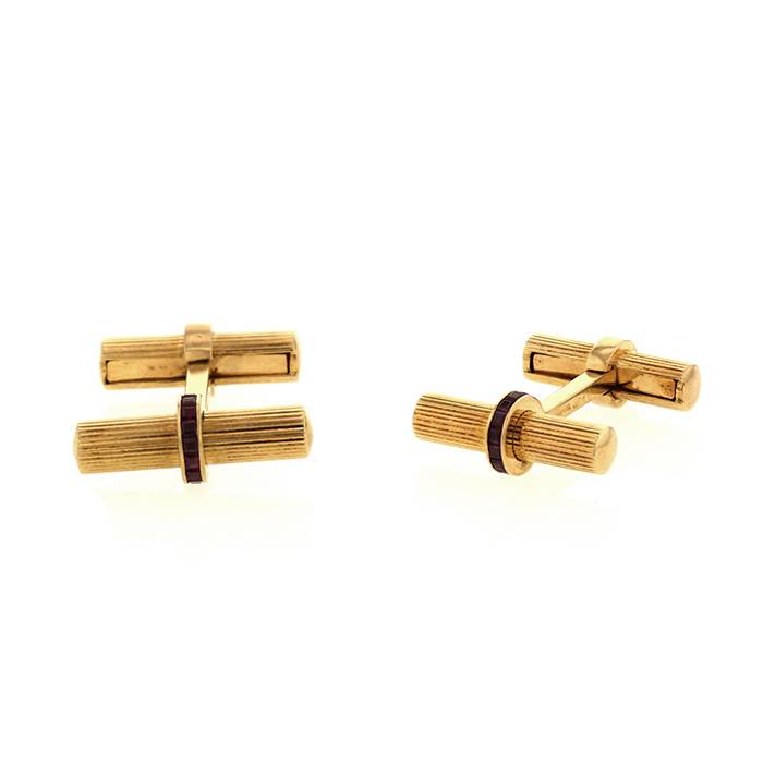 Precioso par de gemelos época años 70 Tiffany & Co de oro amarillo y rubíes, compuesto de elegantes motivos cilíndricos gallonados de oro amarillo, adornado en el centro de encantadores rubíes de tamaño cuadrado.