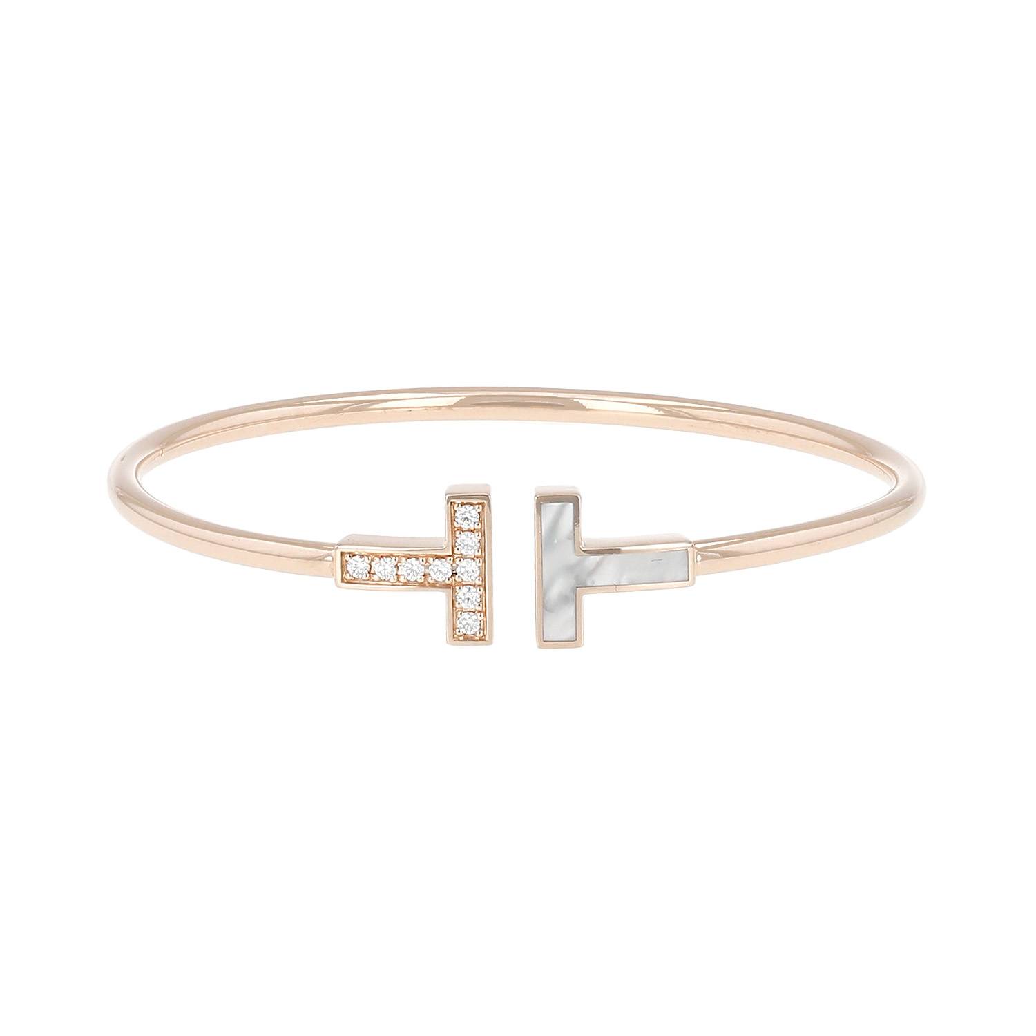 Brazalete Tiffany & Co Wire de oro rosa, de diamantes, y en nácar, compuesto de un bonito anillo semiflexible de oro rosa, adornado en el centro del intemporal letra T de nácar realzada de diamantes de talla brillante.