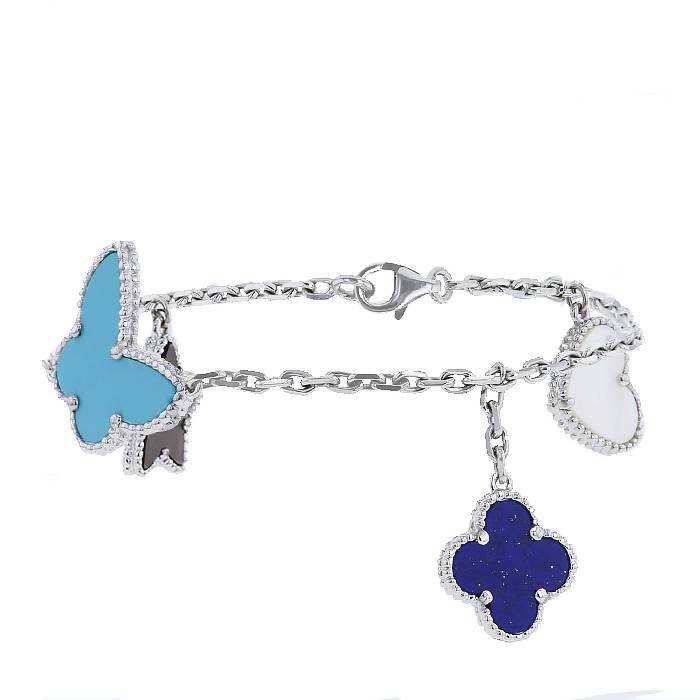Magnífico brazalete Van Cleef & Arpels Lucky Alhambra de oro blanco, de nácar y de turquesa, compuesto de una sucesión de preciosos motivos de nácar blanco, de nácar gris y de lapislázuli, que sujeta 1 encantadora mariposa de turquesa, realzado de delicado borde adornado con perlas de oro blanco.