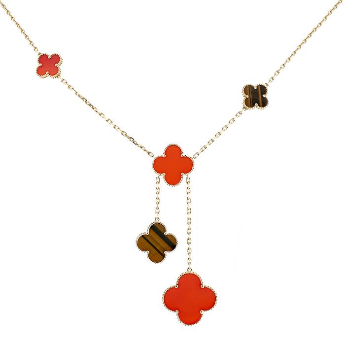 Magnífico collar Van Cleef & Arpels Magic Alhambra de oro amarillo, de cornalina, y en ojo de tigre, compuesto de una alternancia de tréboles de cornalina, de ojo de tigre, rodeado de una elegante borde adornado con perlas de oro amarillo, todo ello sujetado por una cadena de eslabones encadenados.