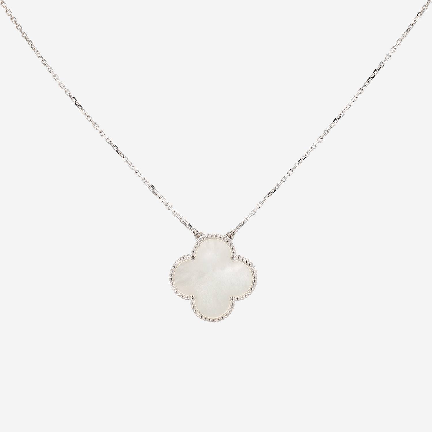Collar Van Cleef & Arpels Magic Alhambra de oro blanco y nácar, compuesto de un importante trébol cuadrilobulado de nácar, adornado de una delicado borde adornado con perlas de oro blanco, sujetado por una cadena de eslabones encadenados de oro blanco.