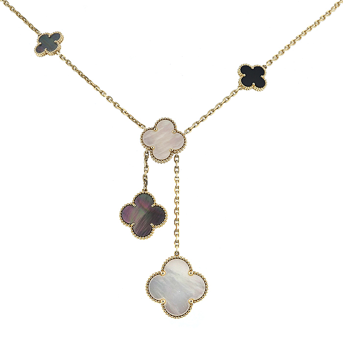 Magnífico collar Van Cleef & Arpels Magic Alhambra de oro amarillo, de nácar y de ónix, compuesto de una muy bonita cadena de eslabones encadenados de oro amarillo, adornado de una sucesión de magníficos tréboles polilobulados de nácar realzados de tréboles polilobulado en ónix, rodeado de un elegante borde adornado con perlas de oro amarillo.