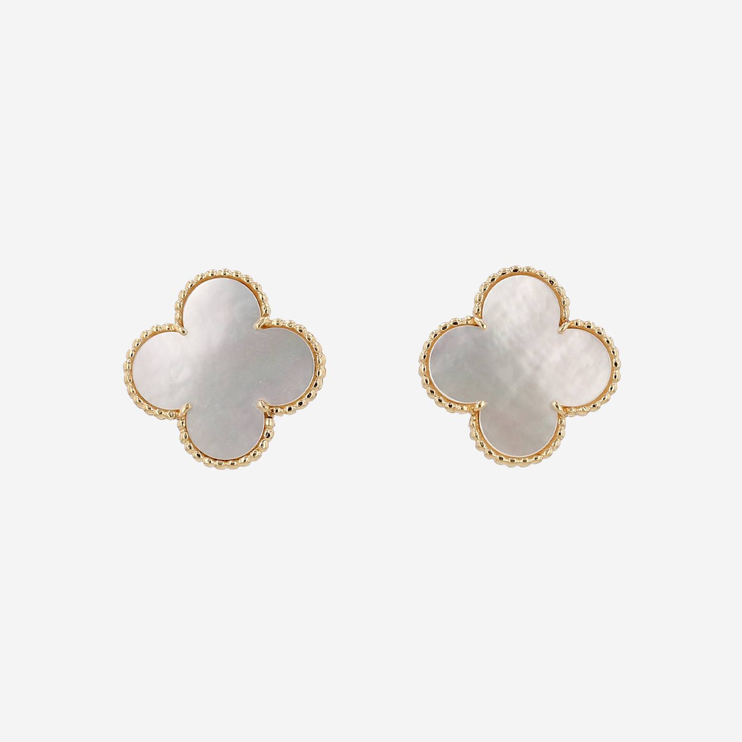 Pendientes Van Cleef & Arpels Magic Alhambra de oro amarillo y nácar (Pinctada Margaritifera), compuestos de 2 inconfundibles tréboles cuadrilobulados de nácar blanco, adornados de una delicado borde adornado con perlas de oro amarillo.