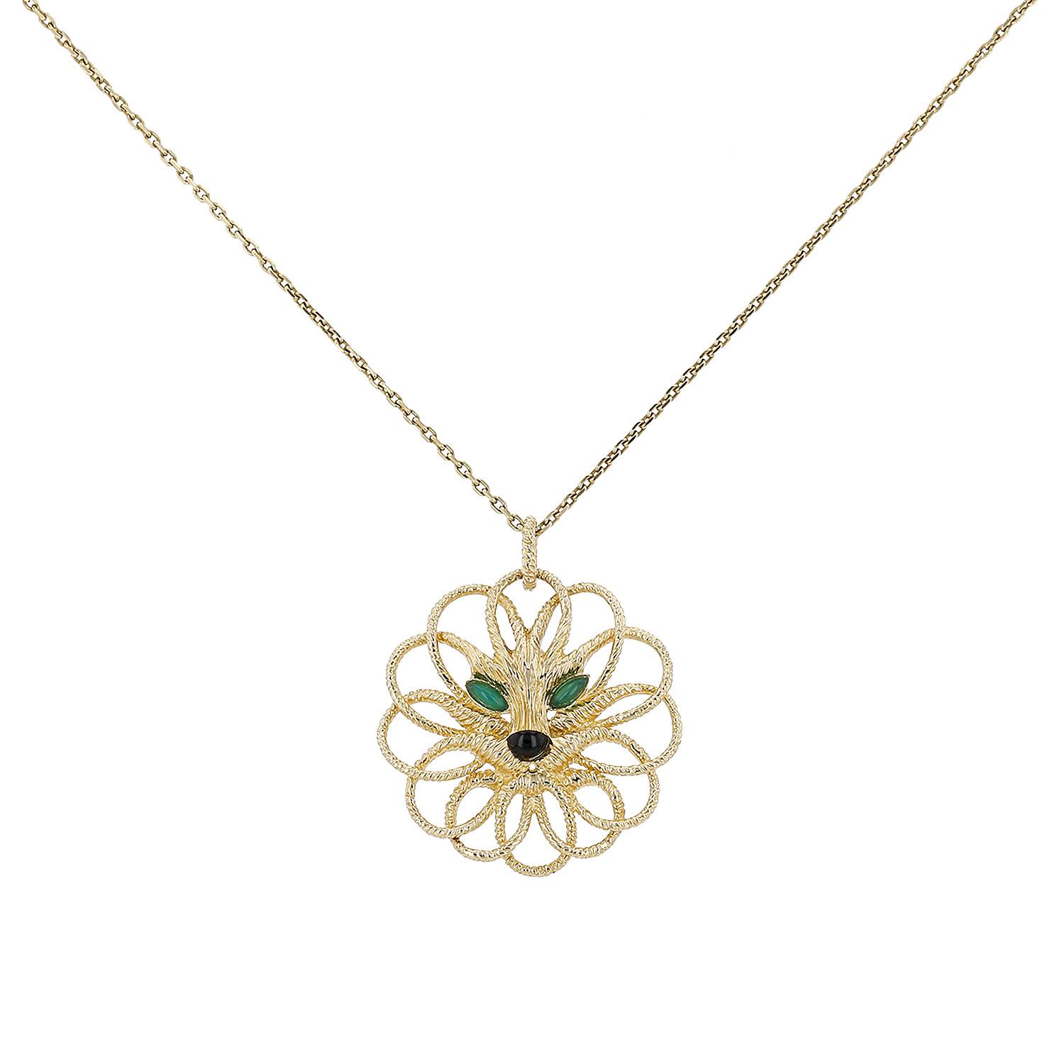 Codiciado colgante Van Cleef & Arpels de oro amarillo, de crisoprasa, y en ónix, estilizando un magnífico león texturado de oro amarillo, adornado de cabujones de crisoprasa de talla marquise realzados de un ónix, sujetado por una cadena de eslabones encadenados de oro amarillo.