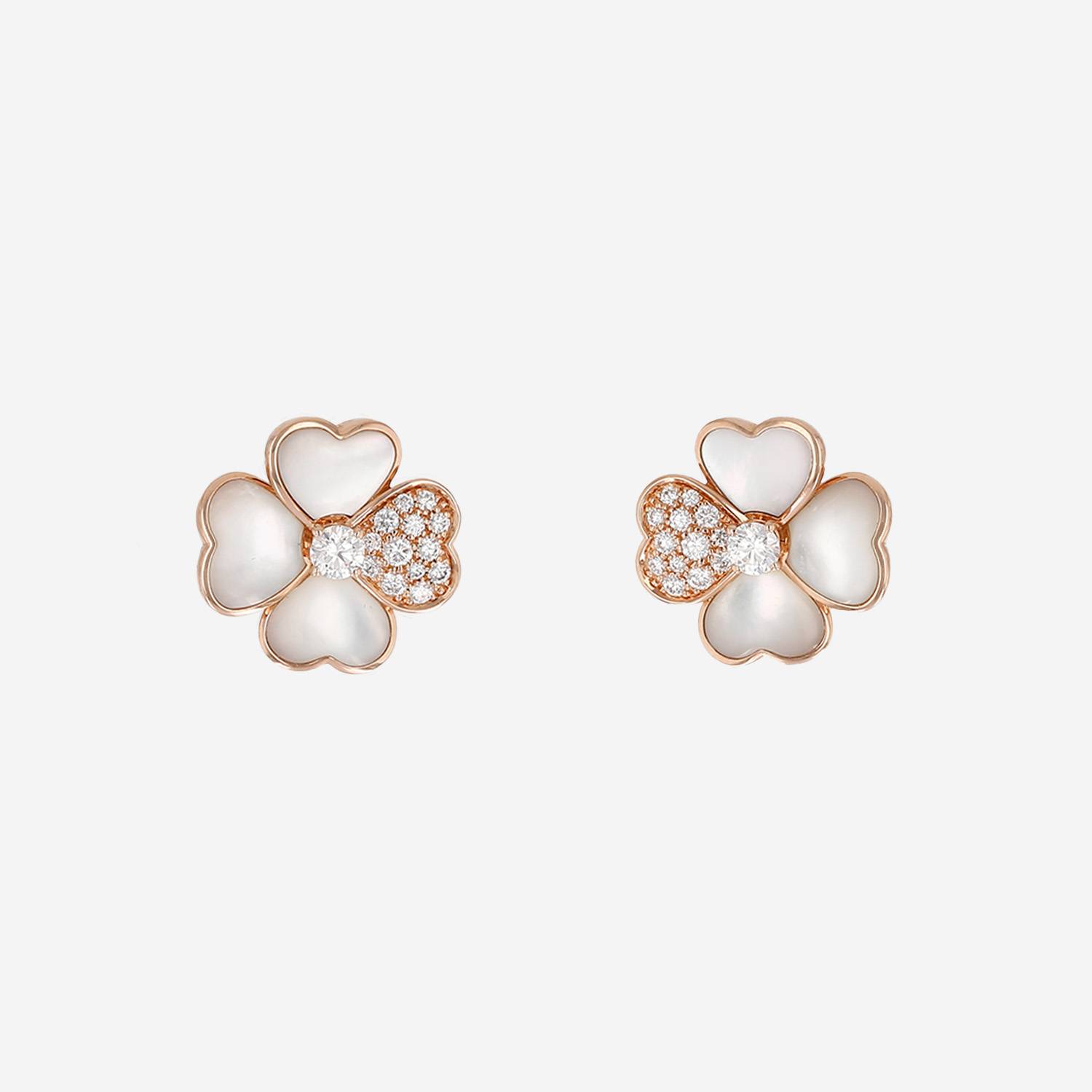 Pendientes Van Cleef & Arpels Cosmos de oro rosa, de nácar (Turbo Marmoratus) y en diamantes, en los cuales figura de preciosos tréboles cuadrilobulados de oro rosa parcialmente engastados de diamantes de talla brillante 0.40 quilate de en total y de motivos abombados de nácar blancos, adornados en el centro de muy bonitos diamantes de talla brillante pesando cada uño 0.20 quilate.