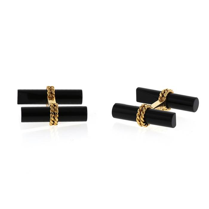 Muy bonito par de gemelos Van Cleef & Arpels de oro amarillo y ónix, compuesto de un delgado engaste retorcido de oro amarillo, que sujeta 4 bonito diseño cilíndrico amovible de ónix.