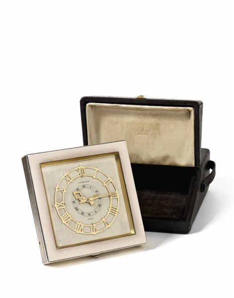 Descripción : Pendulette de voyage en argent. Boîtier carré godronné. Cadran argenté avec index chiffres romains appliqués. Verre biseauté. Mouvement mécanique, remontoir rétractable. Signée. Dim. 10 X 10 cm. Dans son écrin portatif, signé avec ouverture coulissante sur le devant. SANS RESERVE Estimation: € 1,500-2,000Ver la descripción de nuestro expertoA. MARCHAK - PARIS, VERS 1930/1940