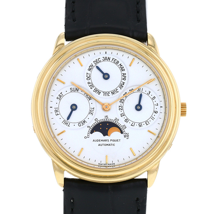Reloj de pulsera Audemars Piguet Quantieme Perpetual Calendar de oro amarillo. Caja de reloj redonda de oro amarillo, fondo de caja con clip, corona acanalada.