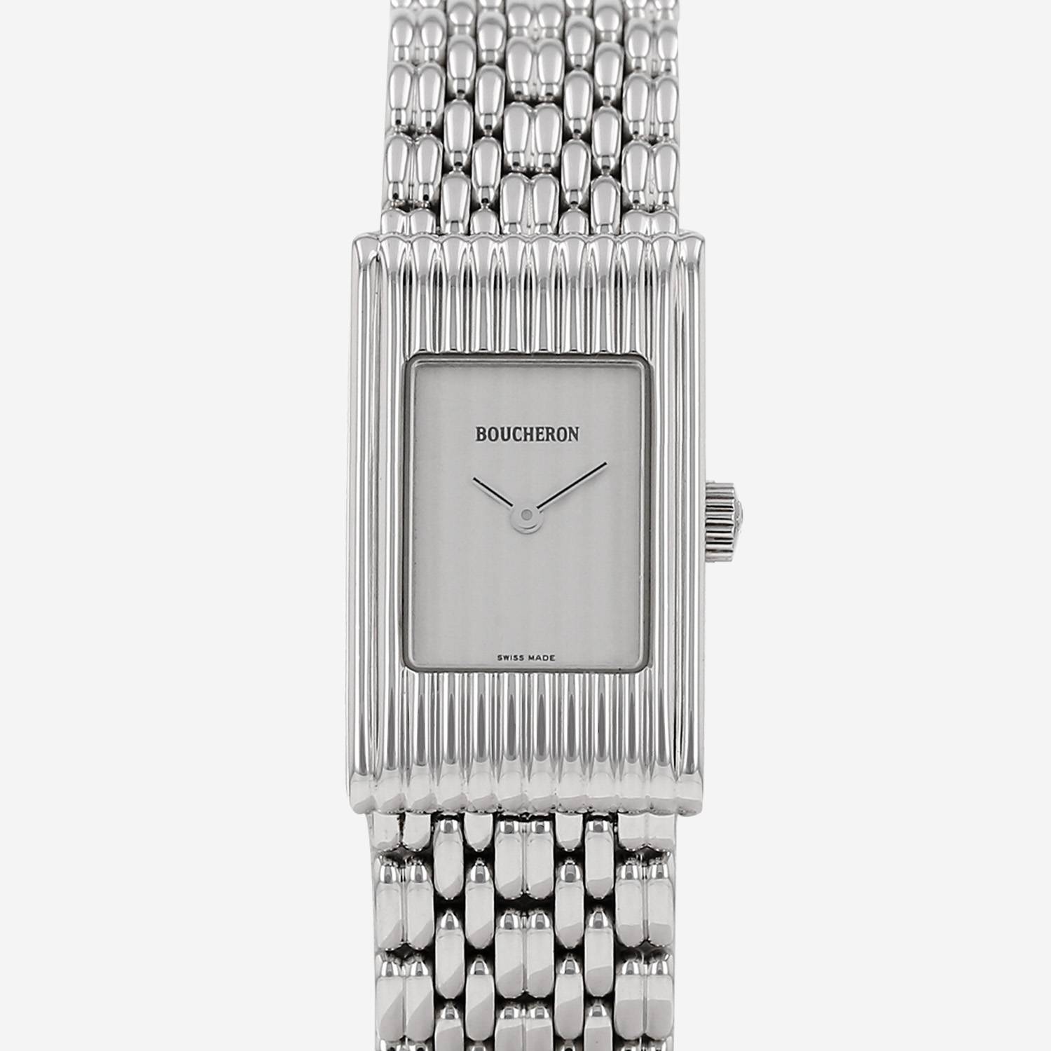 Reloj de pulsera Boucheron Reflet de acero. Caja de reloj rectangular de acero ornamentada, fondo de caja enroscado, corona acanalada.