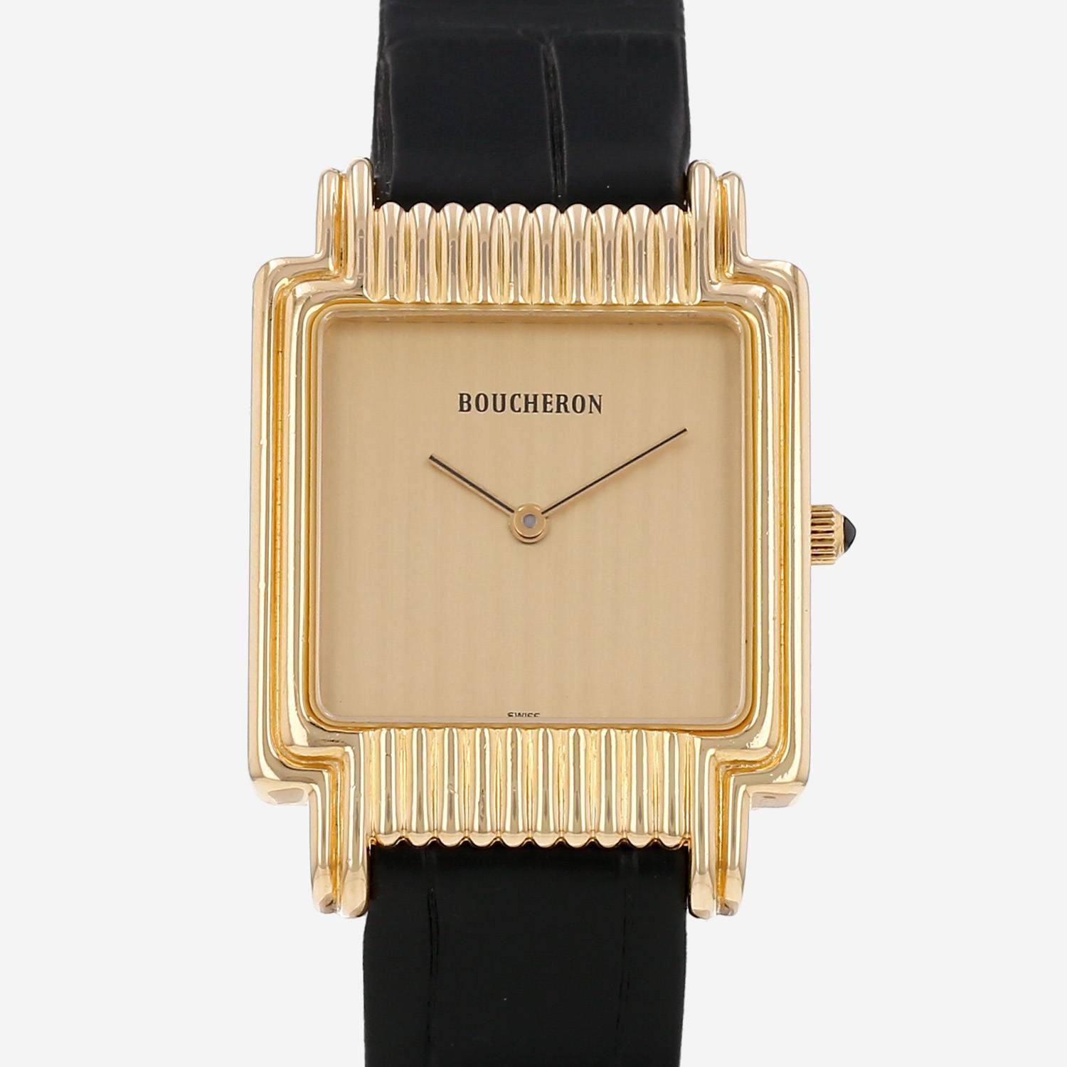 Reloj de pulsera Boucheron Reflet de oro amarillo. Caja de reloj cuadrada de oro amarillo ornamentada, fondo de caja enroscado, corona acanalada engastada con un cabujón zafiro.