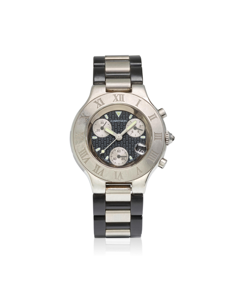 Descripción : Model: 21 Chronoscaph Reference: W10125U2 Date: c. 1990s Movement: Jeweled quartz Dial: Black with the Cartier Double C motif Case: Tonneau form, case back secured by 8 screw, No. 837868LX Strap/Bracelet: Black rubber and stainless steel link Buckle/Clasp: Stainless steel link Signed: Case, dial, movement and clasp Size: 38mm Accompaniments: NoneVer la descripción de nuestro experto[NO RESERVE] CARTIER. A STAINLESS STEEL QUARTZ CHRONOGRAPH BRACELET WATCH