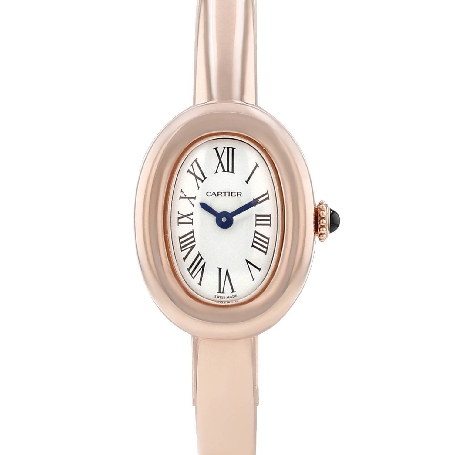 Reloj de pulsera Cartier Baignoire mini de oro rosa. Caja de reloj ovalada de oro rosa, fondo de caja enroscado, corona acanalada engastada con un cabujón zafiro.