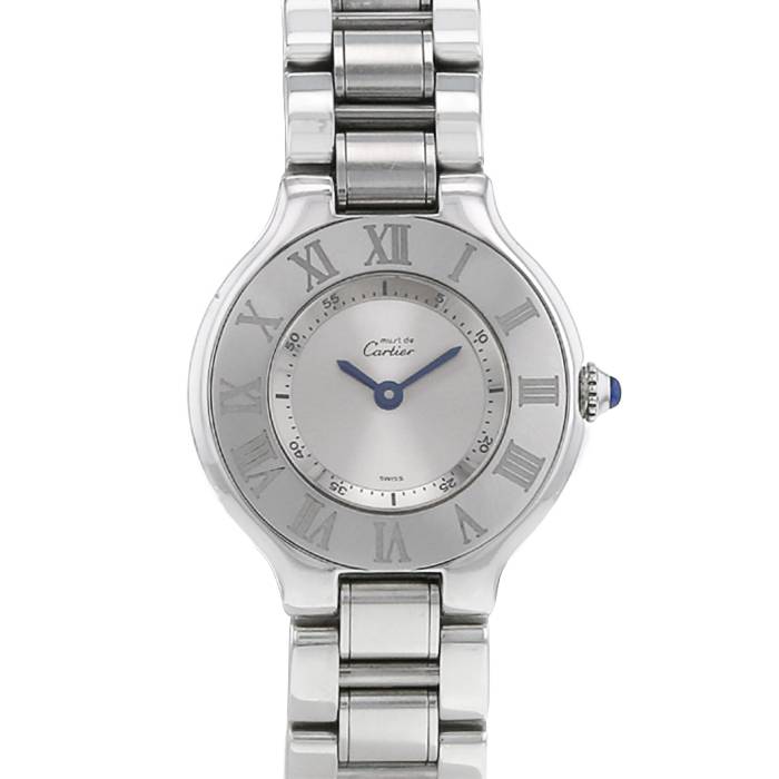 Reloj de pulsera Cartier Must 21 de acero. Caja de reloj redonda de acero, fondo de caja enroscado, bisel graduado, corona engastada con un cabujón de zafiro.