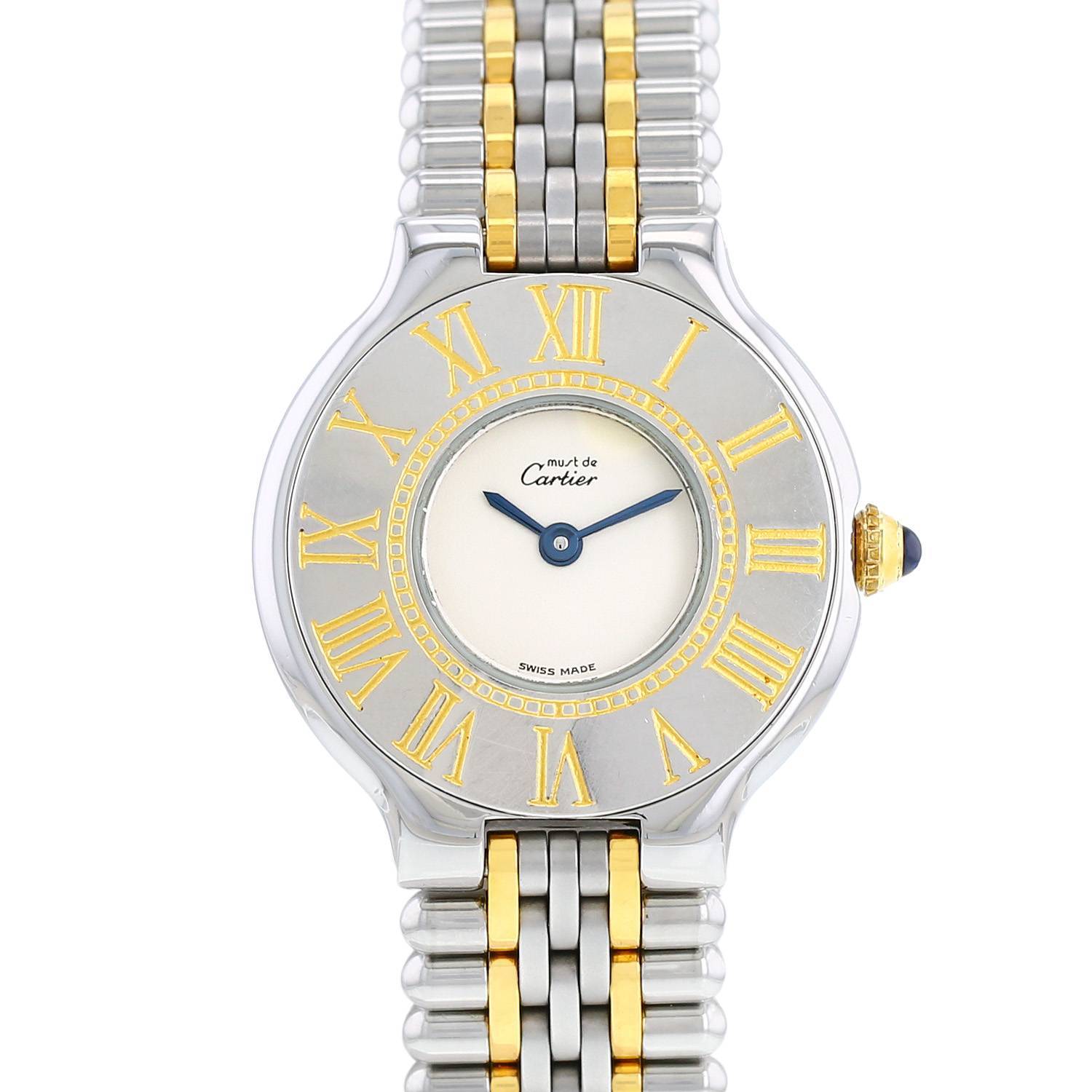 Reloj de pulsera Cartier Must 21 de oro chapado y acero. Caja de reloj redonda de acero, fondo de caja enroscado, bisel graduado, corona engastada con un cabujón de zafiro.