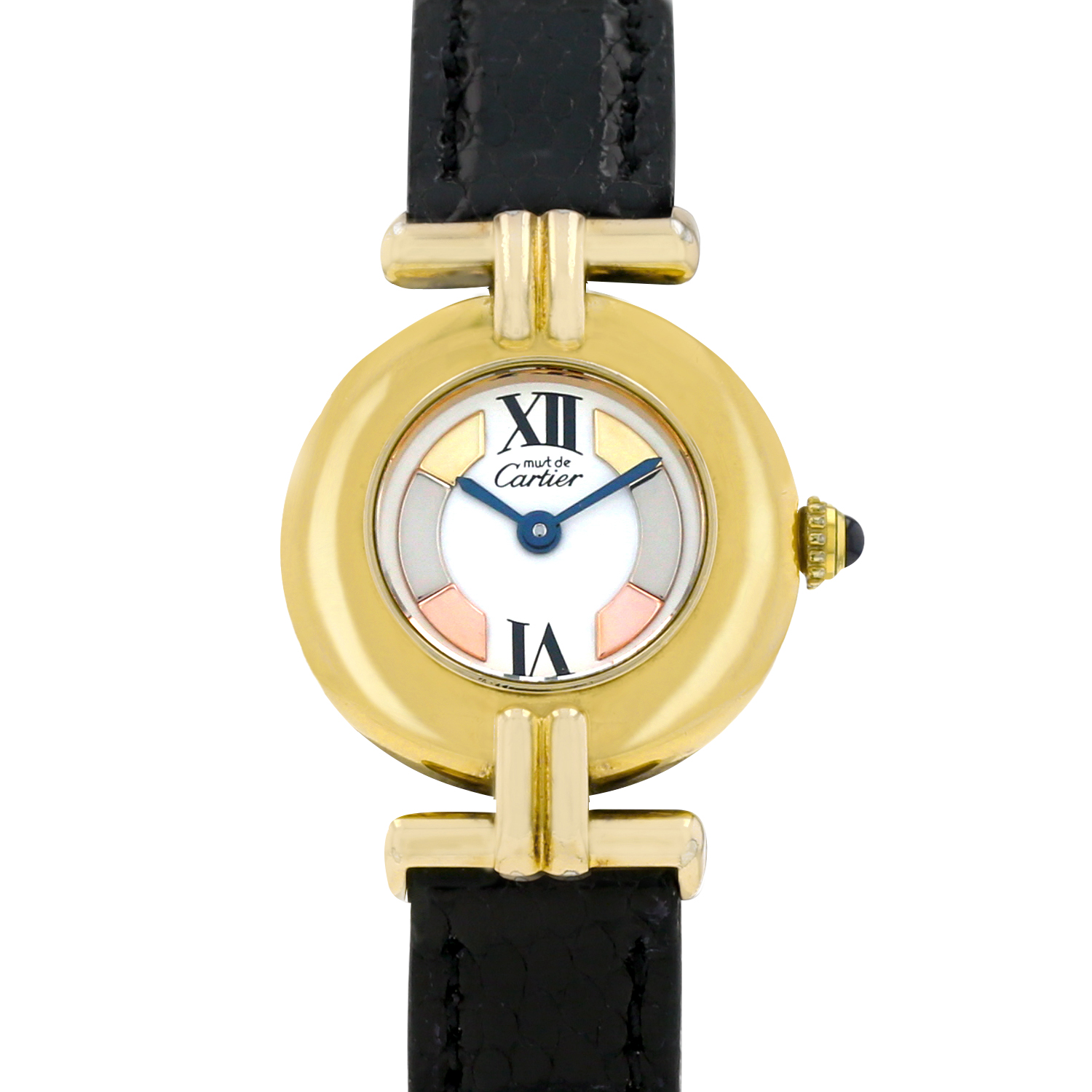 Reloj de pulsera Cartier Must Colisée de plata dorada. Caja de reloj redonda de plata dorada, fondo de caja enroscado, corona engastada con un cabujón de zafiro.