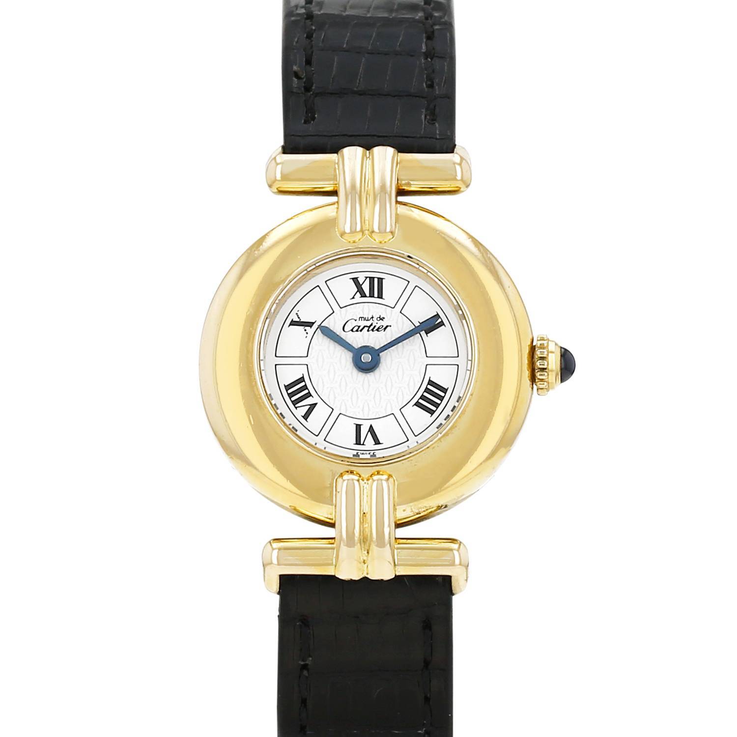 Reloj de pulsera Cartier Must Colisée de plata dorada. Caja de reloj redonda de plata dorada, fondo de caja enroscado, corona acanalada engastada con un cabujón zafiro.