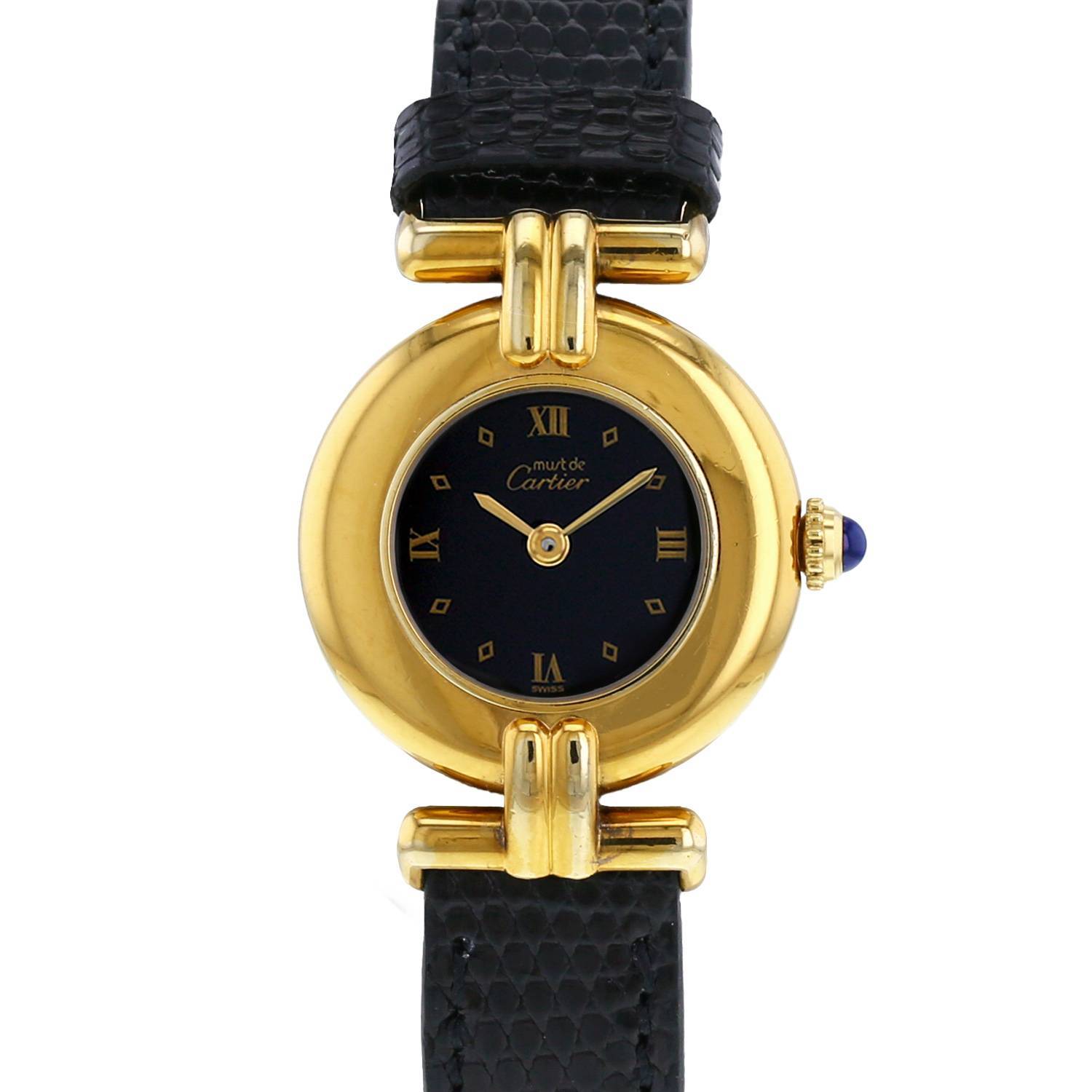 Reloj Cartier Must Colisée de plata dorada. Caja de reloj redonda de plata dorada, fondo de caja enroscado, corona engastada con un cabujón de zafiro.