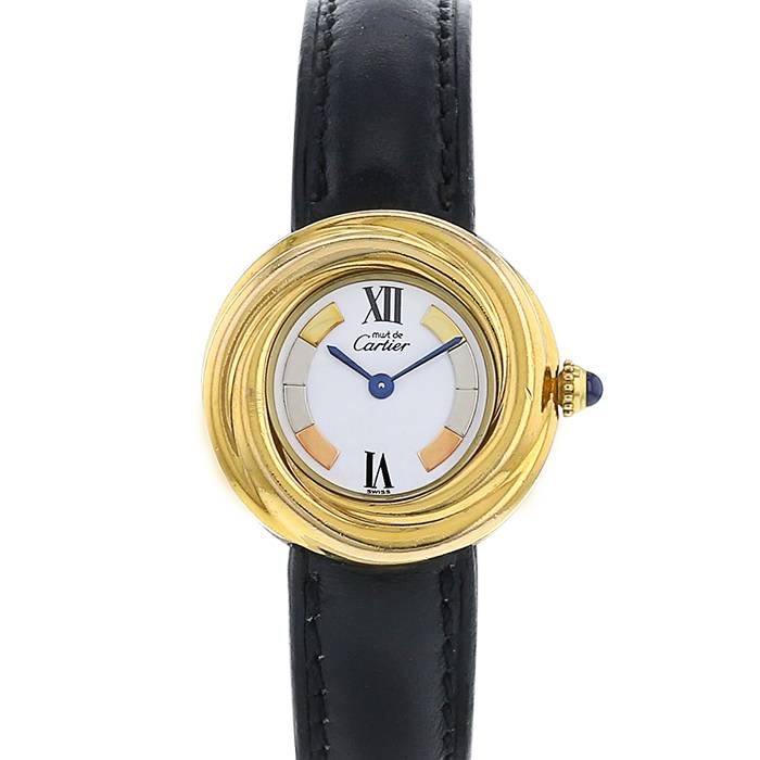 Reloj de pulsera Cartier Must De Cartier de plata dorada. Caja de reloj redonda de plata dorada, fondo de caja enroscado, corona acanalada engastada con un cabujón de zafiro azul.