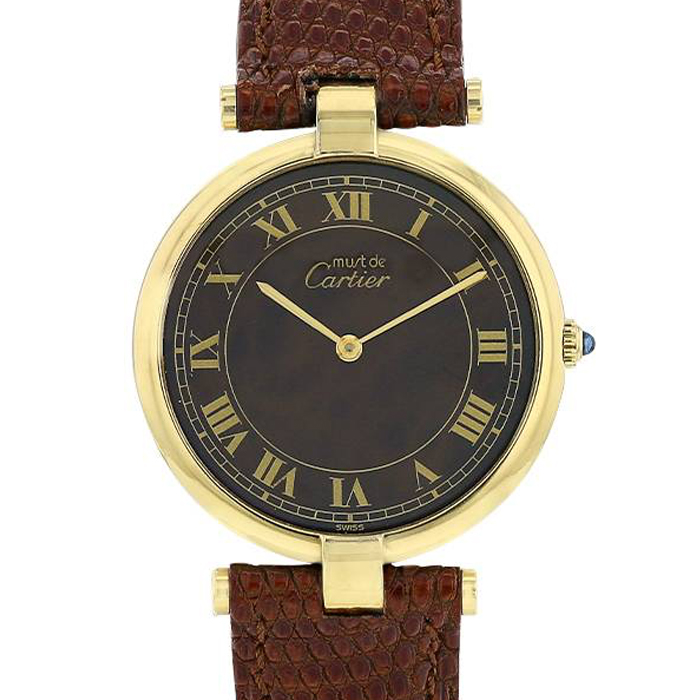 Reloj de pulsera Cartier Must Vendôme de oro amarillo. Caja de reloj redonda de oro chapado, fondo de caja enroscado, corona acanalada engastada con un cabujón de zafiro azul.