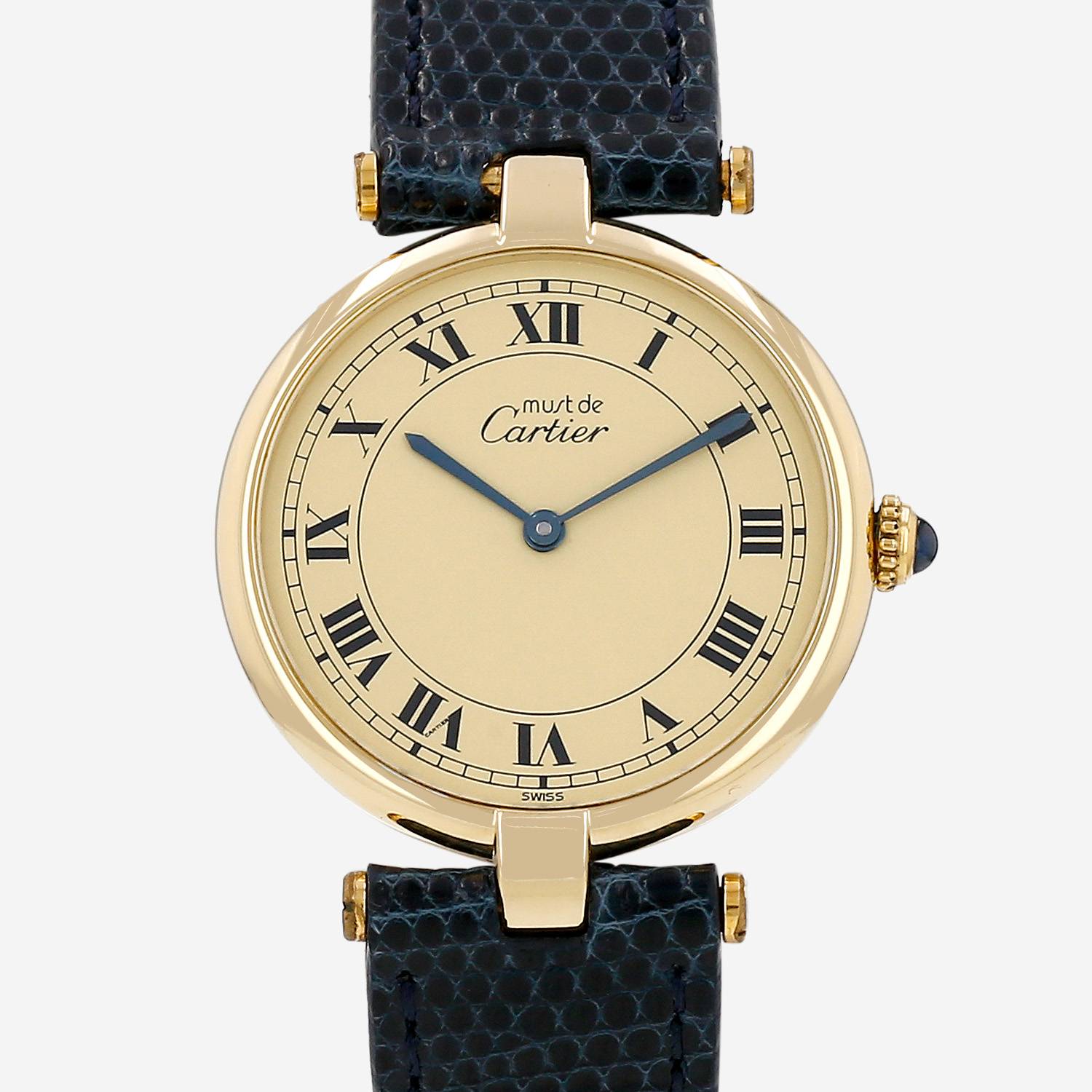Reloj de pulsera Cartier Must Vendôme de plata dorada. Caja de reloj redonda de plata dorada, fondo de caja enroscado, corona acanalada engastada con un cabujón zafiro.