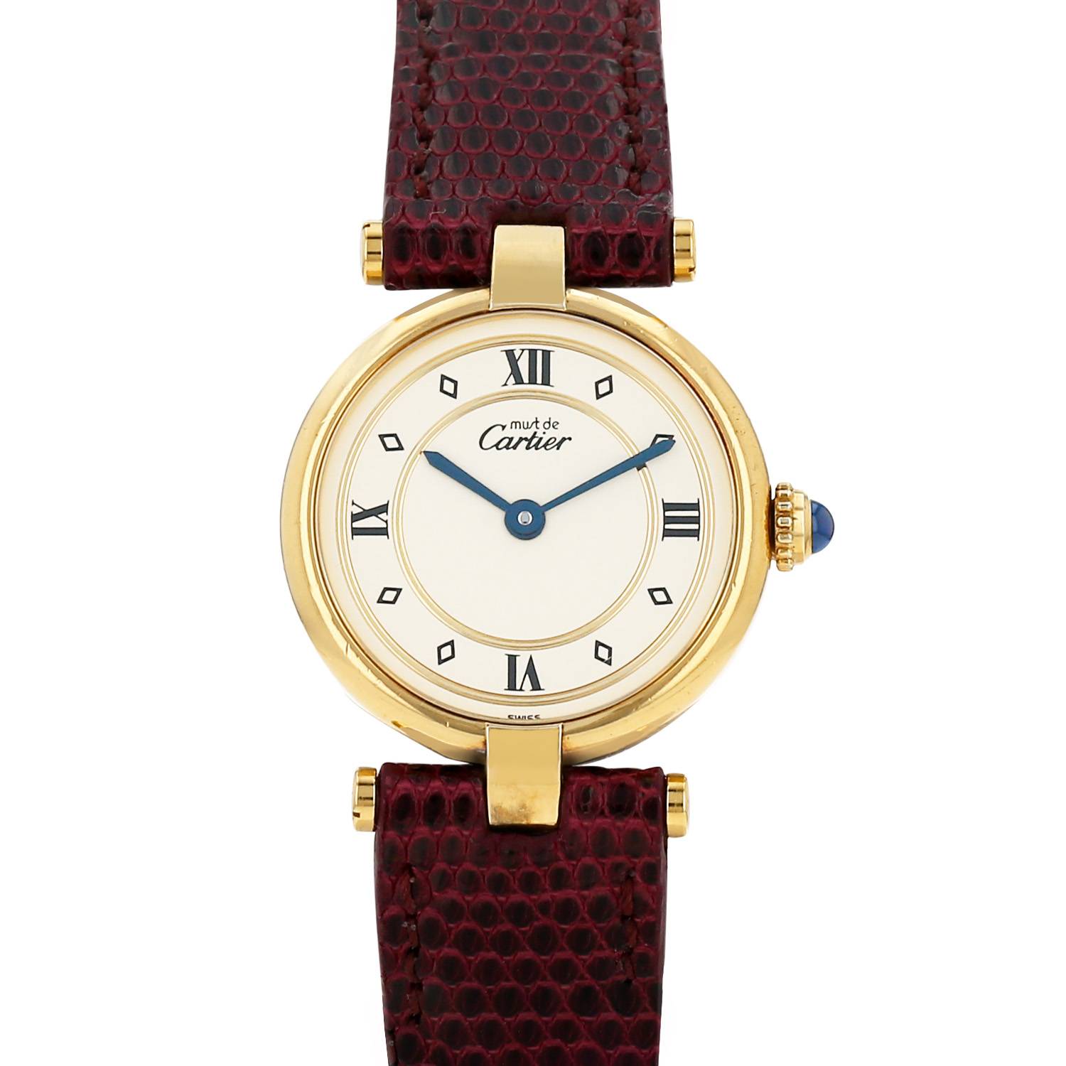 Reloj de pulsera Cartier Must Vendôme de plata dorada. Caja de reloj redonda de plata dorada con fijaciones vendôme, fondo de caja enroscado, corona acanalada engastada con un cabujón zafiro.
