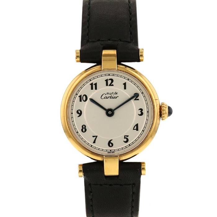 Reloj de pulsera para mujer Cartier Must De Cartier de plata dorada. Caja de reloj redonda de plata dorada, fondo de caja con clip, corona acanalada engastada con un cabujón de zafiro.
