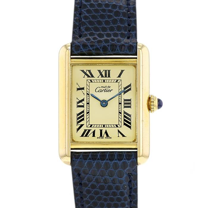 Reloj de pulsera Cartier Tank Must de plata dorada. Caja de reloj rectangular de plata dorada, fondo de caja enroscado, corona engastada con un cabujón de zafiro azul.