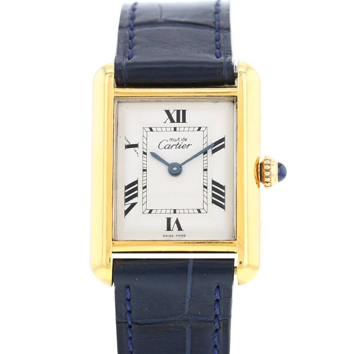 Reloj de pulsera Cartier Tank Must de plata dorada. Caja de reloj rectangular de plata dorada, fondo de caja enroscado, corona acanalada engastada con un cabujón de zafiro y azul.