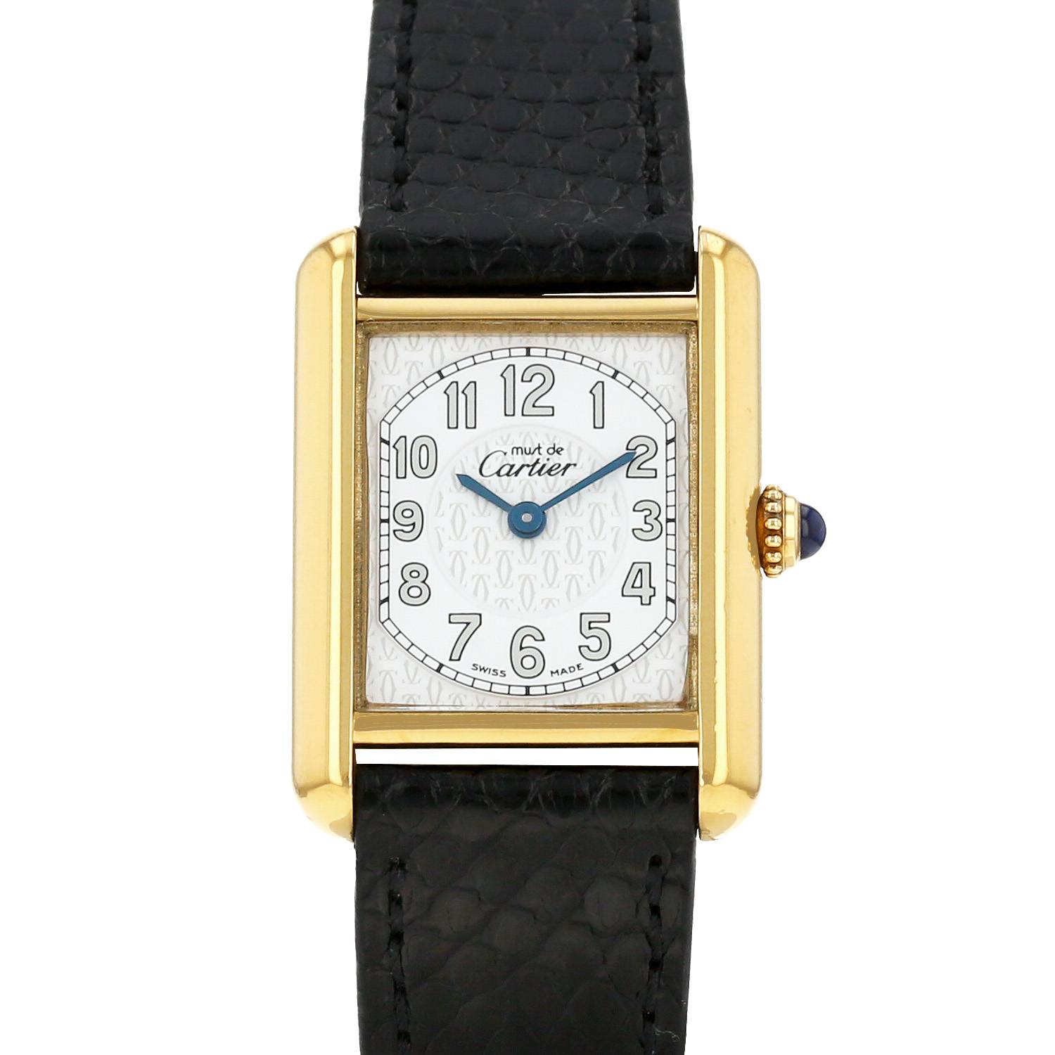 Reloj de pulsera Cartier Tank Must de plata dorada. Caja de reloj rectangular de plata dorada, fondo de caja enroscado, corona engastada con un cabujón de zafiro.