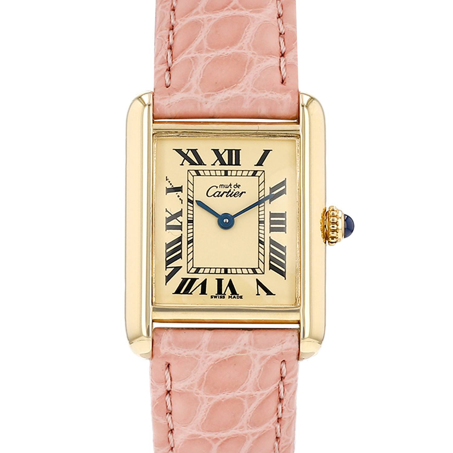 Reloj de pulsera Cartier Tank Must de plata dorada. Caja de reloj rectangular de plata dorada, fondo de caja enroscado, corona acanalada engastada con un cabujón zafiro.