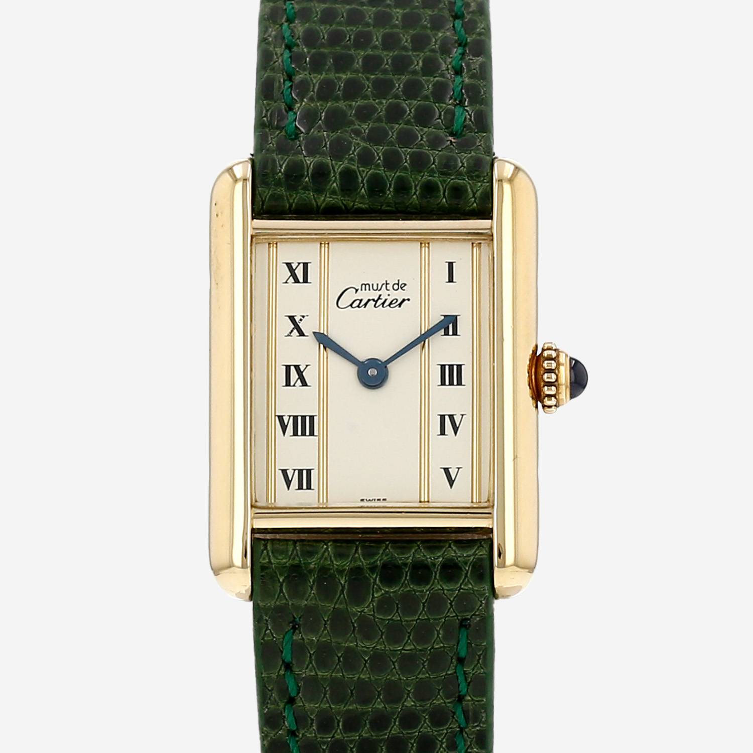 Reloj de pulsera Cartier Tank Must de plata dorada. Caja de reloj rectangular de plata dorada, fondo de caja enroscado, corona acanalada engastada con un cabujón zafiro.