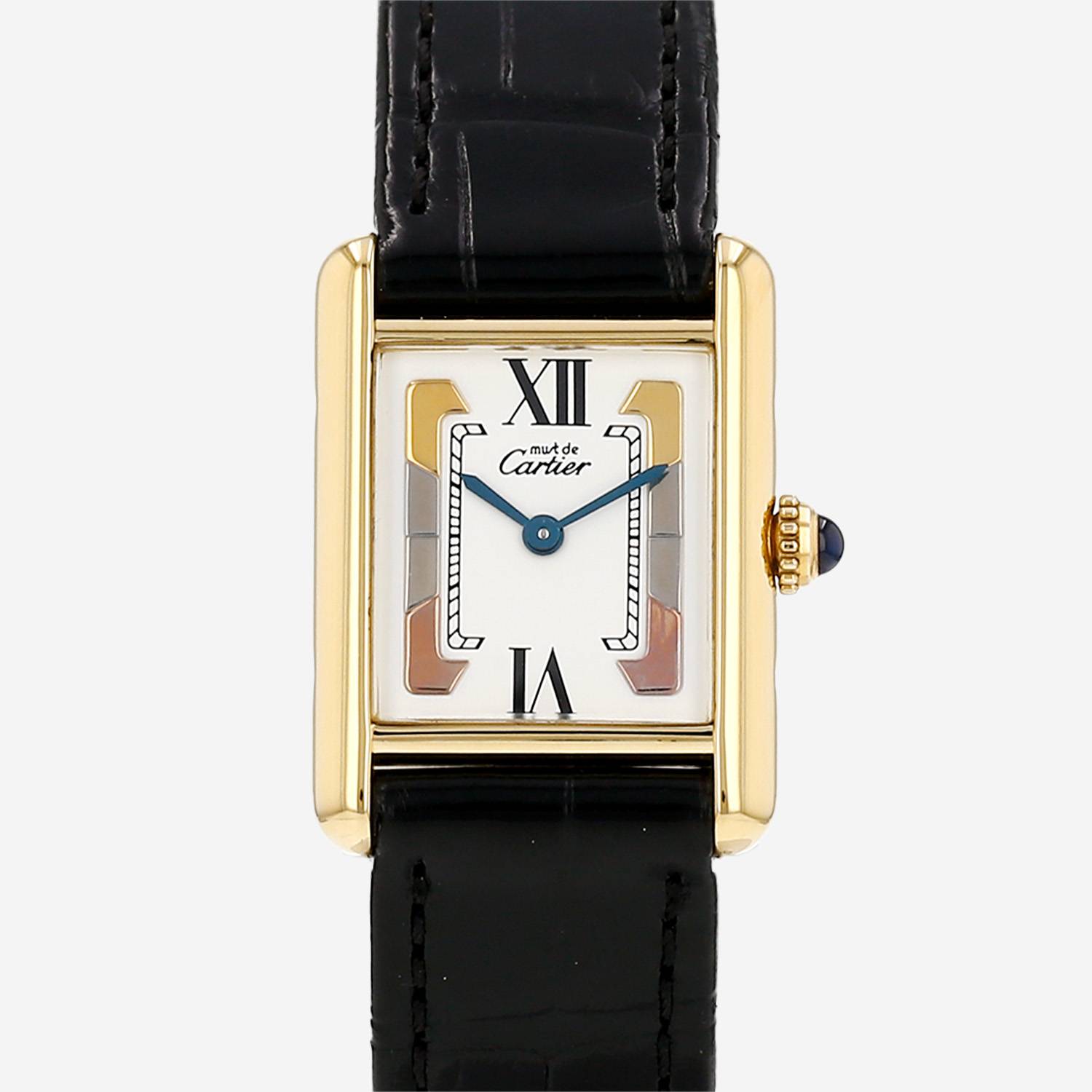 Reloj de pulsera Cartier Tank Must de plata dorada. Caja de reloj rectangular de plata dorada, fondo de caja enroscado, corona acanalada engastada con un cabujón zafiro.