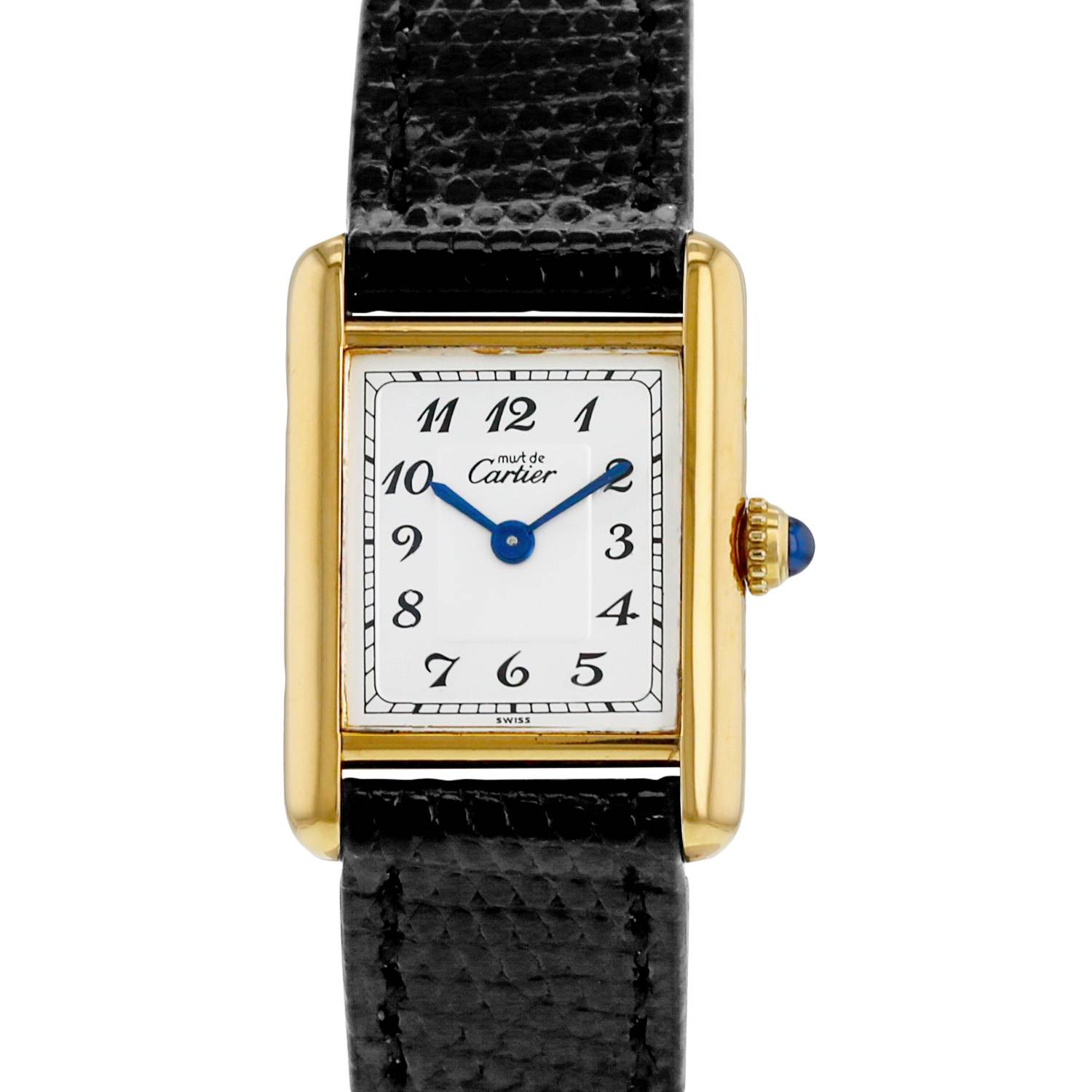 Reloj de pulsera Cartier Tank Must de plata dorada. Caja de reloj rectangular de plata dorada, fondo de caja enroscado, corona engastada con un cabujón de zafiro.