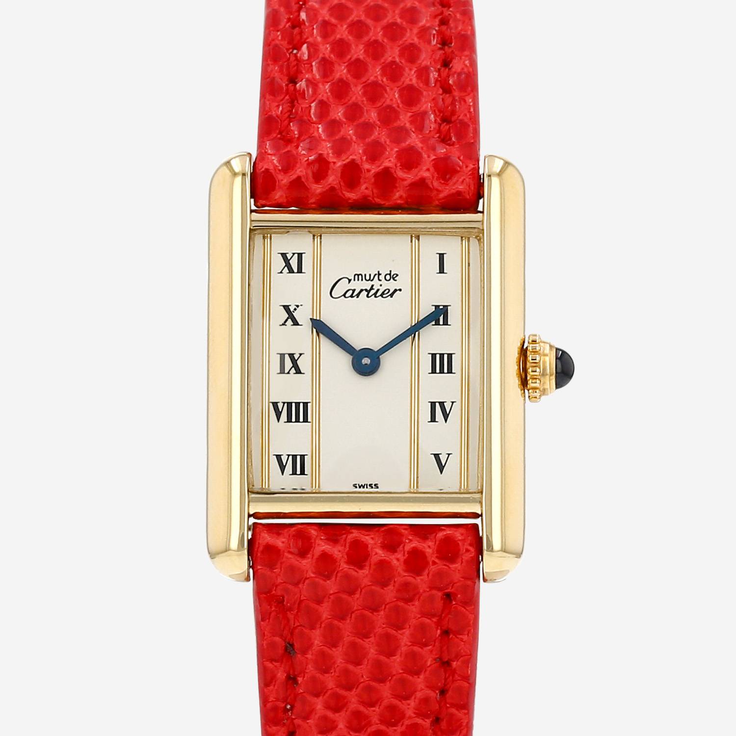 Reloj de pulsera Cartier Tank Must de plata dorada. Caja de reloj rectangular de plata dorada, fondo de caja enroscado, corona engastada con un cabujón zafiro.