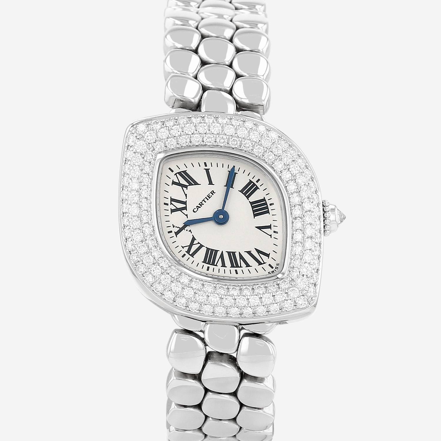 Reloj de pulsera Cartier Navette de oro blanco. Caja de reloj de oro blanco, fondo de caja enroscado, bisel de oro blanco engastada con diamantes, corona acanalada engastada con un cabujón de diamante.