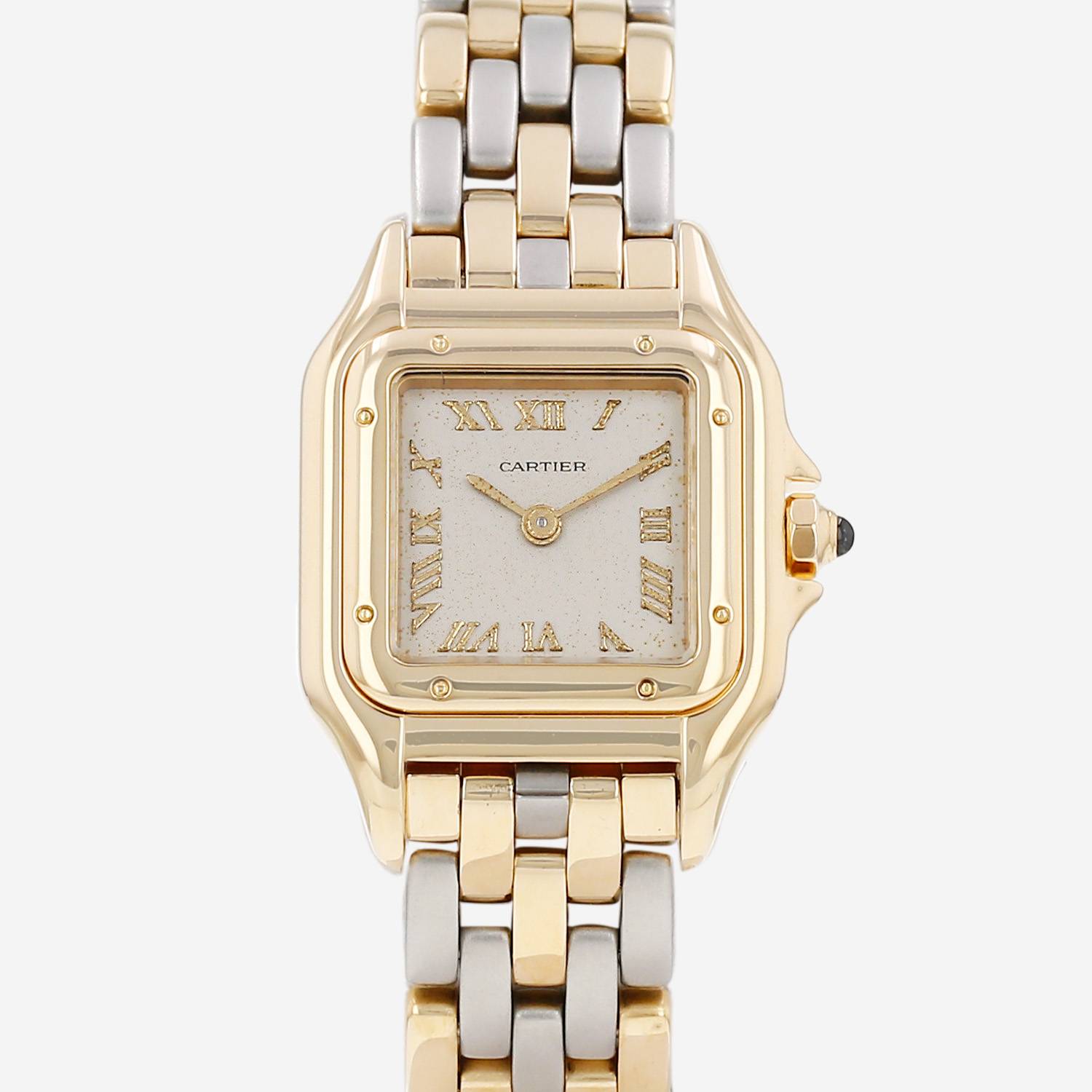 Reloj de pulsera Cartier Panthère de oro y acero. Caja de reloj cuadrada de oro amarillo, fondo de caja enroscado, bisel enroscado de oro amarillo, corona acanalada engastada con un cabujón zafiro.