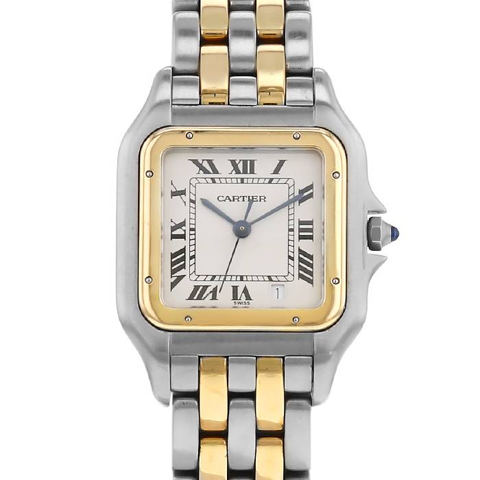 Famoso reloj de pulsera para mujer Cartier Panthère de oro y acero. Caja de reloj cuadrada de oro amarillo, bisel enroscado, corona acanalada engastada con un cabujón de zafiro.