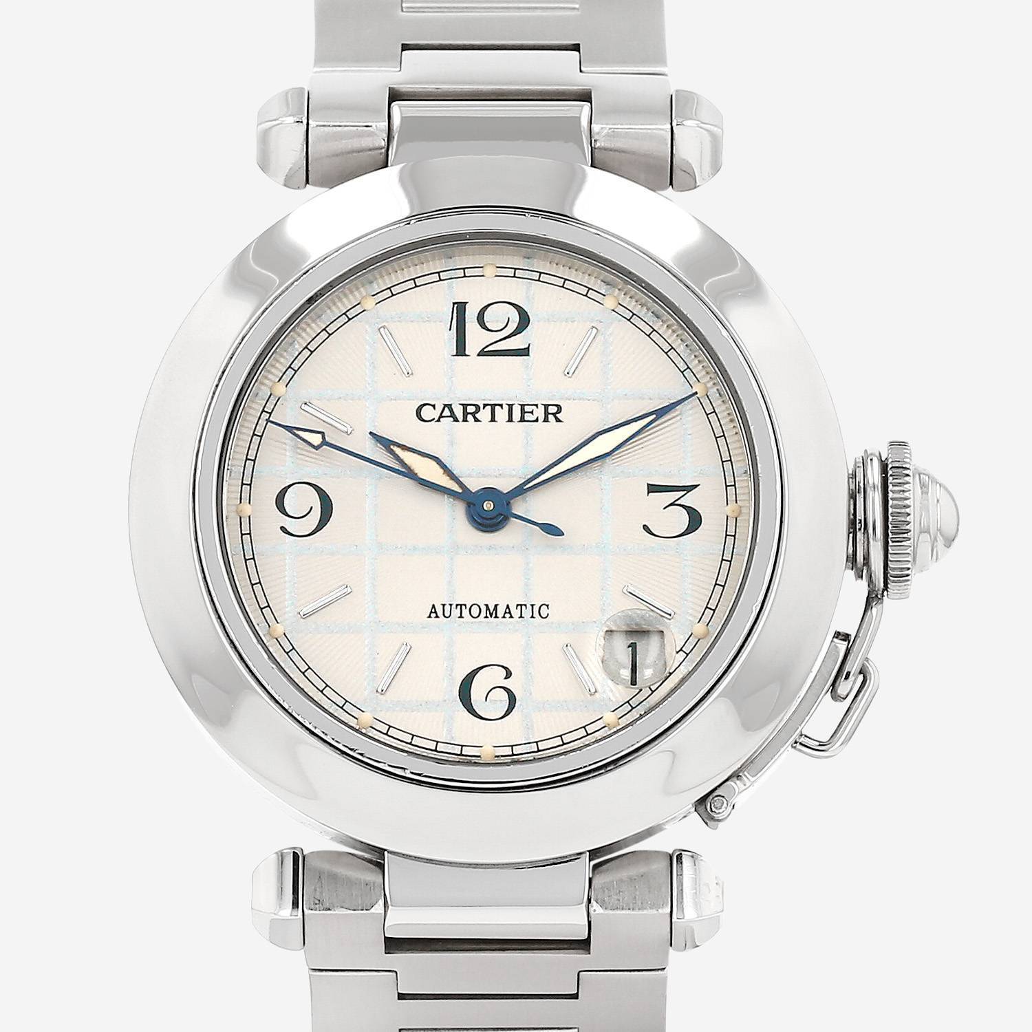 Reloj de pulsera Cartier Pasha de acero. Caja de reloj redonda de acero, fondo de caja enroscado, protección de corona enroscada.