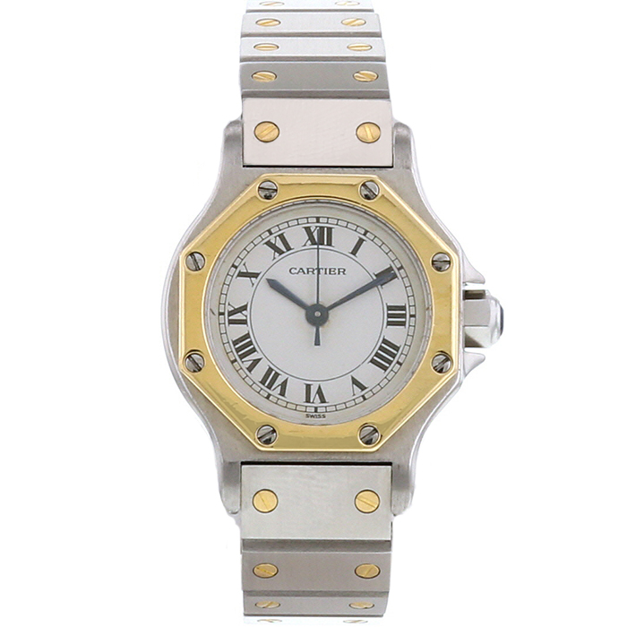 Reloj de pulsera para mujer Cartier Santos Ronde de oro y acero. Caja de reloj octogonal de oro y acero, bisel de oro amarillo, corona engastada con un cabujón zafiro.