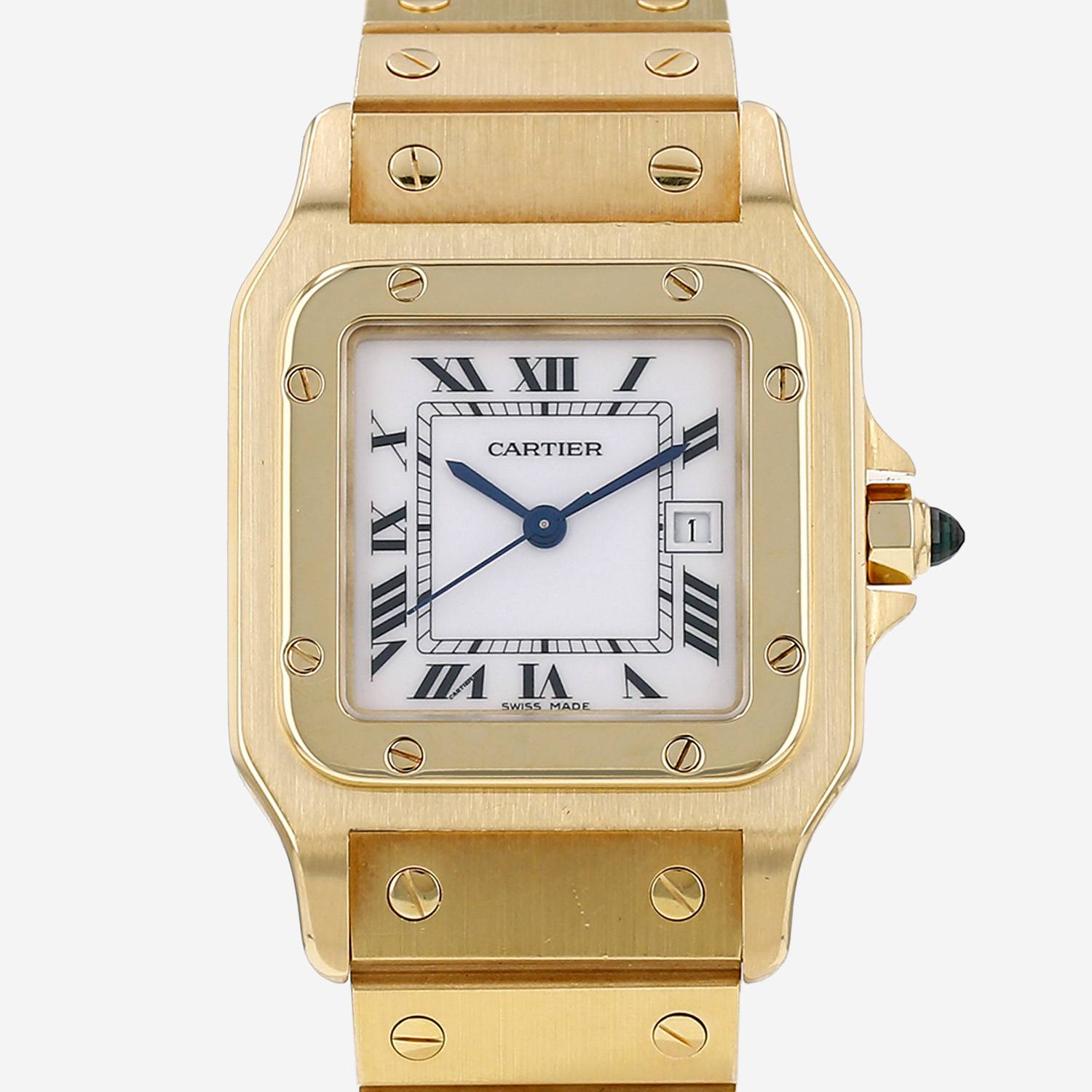 Reloj de pulsera Cartier Santos Galbée de oro amarillo. Caja de reloj cuadrada de oro amarillo, fondo de caja enroscado, bisel enroscado de oro amarillo, corona engastada con un cabujón zafiro.