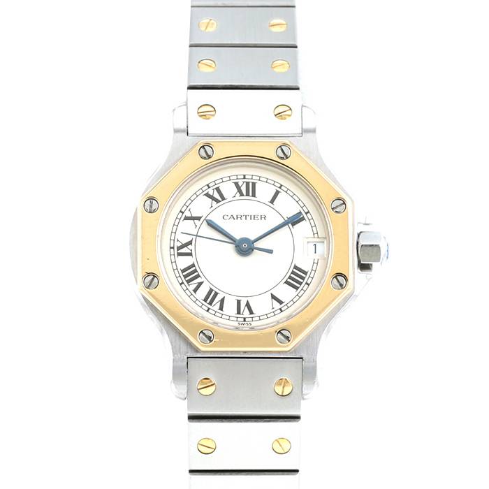 Reloj de pulsera Cartier Santos Octogonale de acero y oro y acero. Caja de reloj octogonal de oro y acero, fondo de caja enroscado, bisel enroscado de oro, corona acanalada engastada con un cabujón de zafiro y azul.