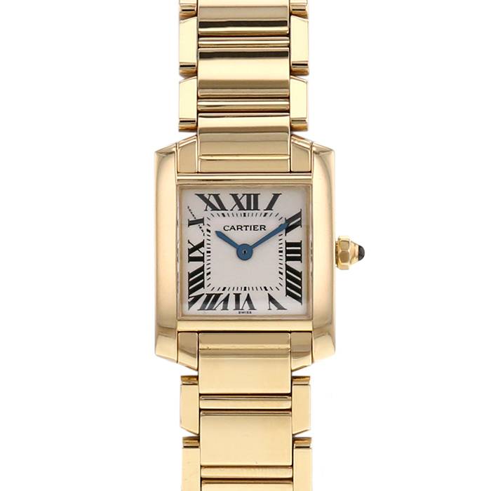 Reloj de pulsera para mujer Cartier Tank Française de oro amarillo. Caja de reloj rectangular de oro amarillo, fondo de caja enroscado, corona acanalada engastada con un cabujón de zafiro.